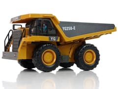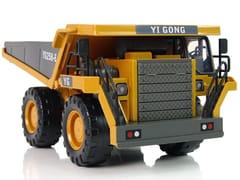 A remote-controlled construction vehicle is a realistically reproduced model. The yellow tipper is decorated with black details, as well as characteristic stickers. The remote control has a frequency of 2.4 Ghz. The operation of the R/C remote control is very simple, two joysticks will allow for convenient maneuvering. With its help, the truck operator can steer it, changing directions to forward/backward and right/left, adjust the volume and, above all, move the tipper.