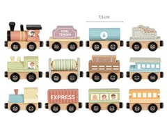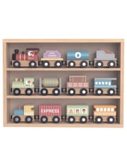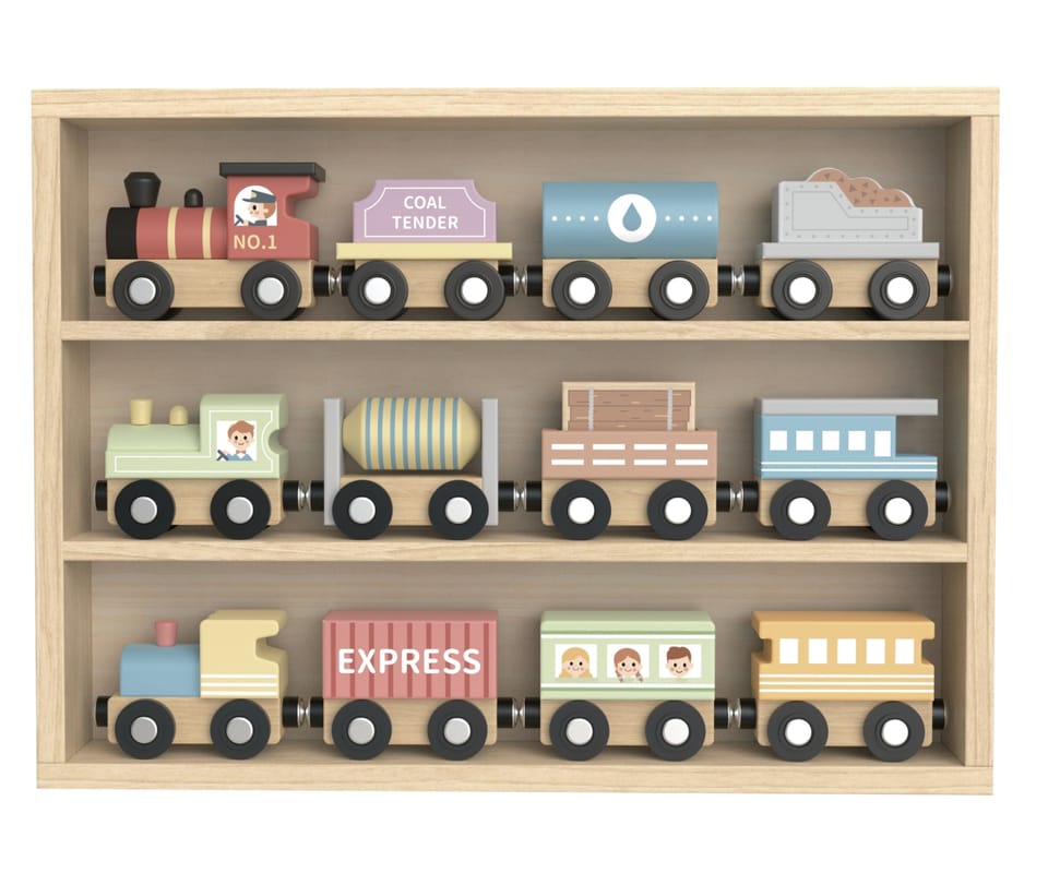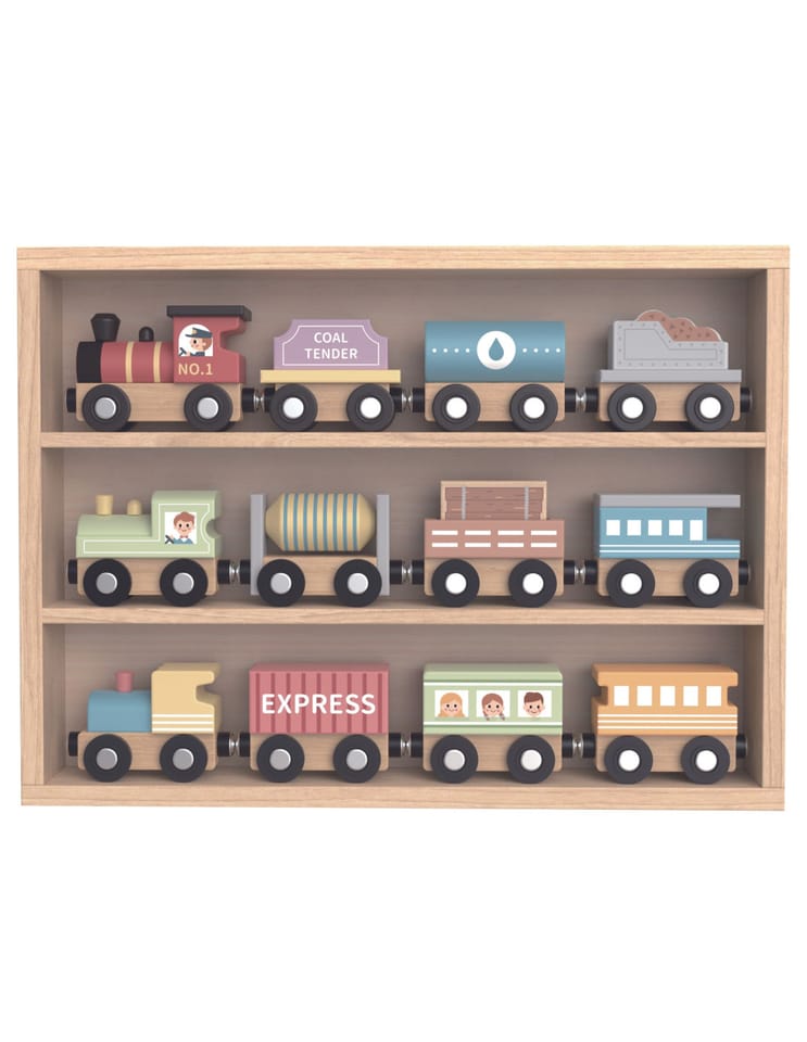 Zestaw drewnianych wagoników i lokomotyw od Tooky Toy to idealna zabawka dla małych miłośników pociągów. Komplet składa się z 13 kolorowych elementów, które można dowolnie łączyć dzięki wbudowanym magnesom. Całość zamknięta jest w estetycznym, drewnianym pudełku z półkami, które służy jednocześnie jako organizer i wystawka dla małej kolekcji.Kolejki można używać w różnych kombinacjach tworząc własne trasy i historie podróży. Ćwiczyć sortowanie kolorami, typem wagonów i kolejnością. Produkt wykonany z drewna z certyfikatem FSC®. Malowany bezpiecznymi farbami na bazie wody i gładko wykończony, bez ostrych krawędziZalety rozwojowe: