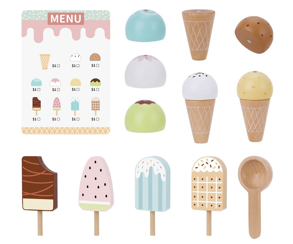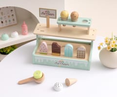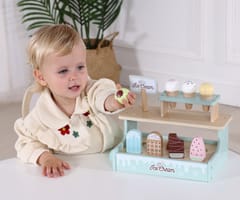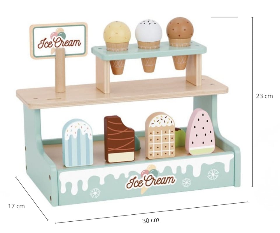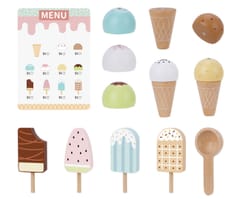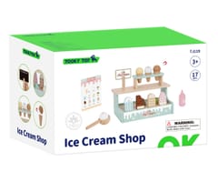 Tooky Toy TJ119 to uroczy, drewniany zestaw do zabawy w lodziarnię, idealny dla dzieci od 3. roku życia. Składa się z 17 elementów, w tym: różnych lodów w rożku i na patyku, gałek lodowych z magnesami, łyżki do nakładania, buteleczki z polewą, menu oraz stojaka/lada do ekspozycji deserów.Dziecko może bawić się w sprzedawcę lodów – obsługiwać klientów, podawać lody, liczyć zapłatę według menu. Tworzyć, własne kombinacje deserów – gałki lodów łączą się z rożkami za pomocą magnesów. Układać lody na wystawie – zabawa w aranżację i ekspozycję lodziarni. Odtwarzać scenki z życia – rozwijać wyobraźnię, tworzyć dialogi z rodzicami lub rówieśnikami.Zalety zabawki: