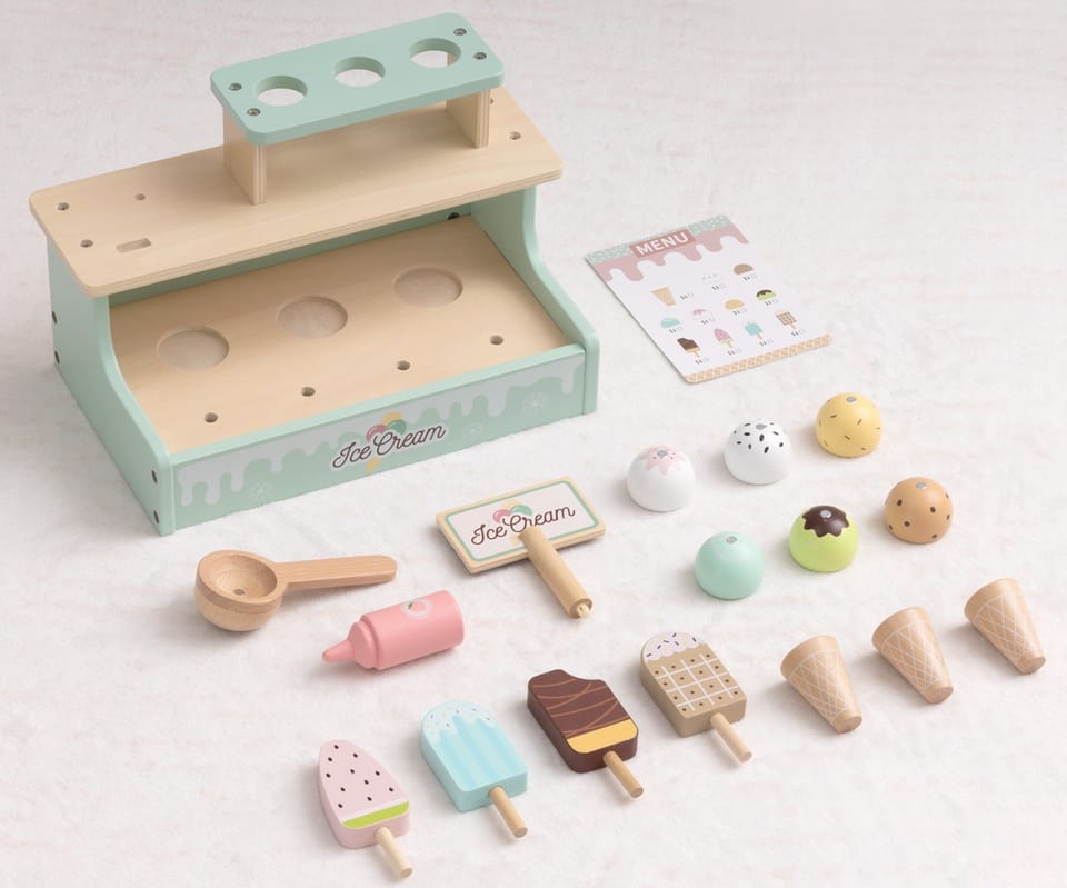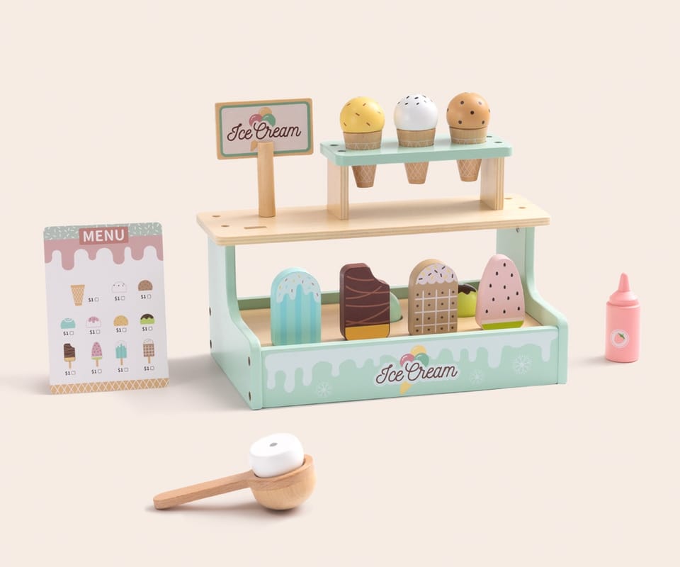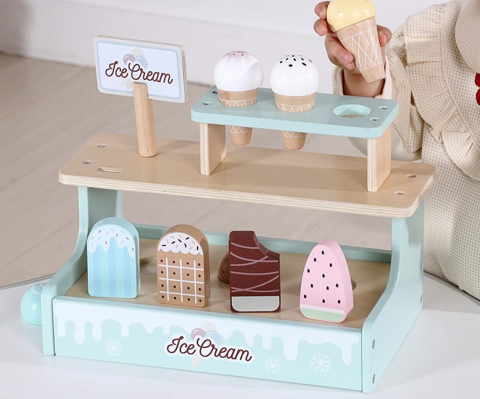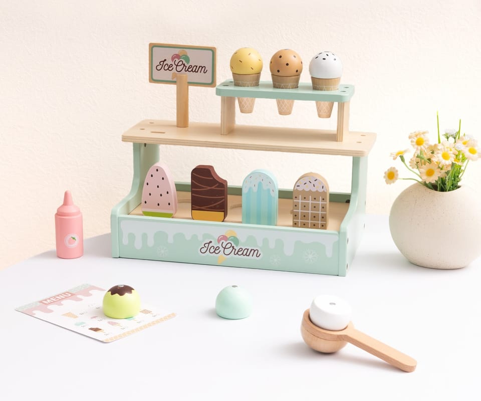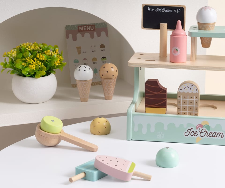 - Rozwój wyobraźni i kreatywności. Dziecko tworzy własne historie, scenki sprzedaży i wymyśla różne kombinacje lodów.