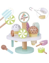 Tooky Toy TK135 to drewniany zestaw do zabawy w lodziarnię stworzony z myślą o najmłodszych dzieciach (od 3 roku życia). Zestaw składa się z kolorowej, dwupoziomowej podstawki z oznaczeniem "Ice Cream", na której można eksponować różne rodzaje lodów – w tym rożki, lody na patyku i lizaki. W komplecie znajduje się łącznie 9 elementów, m.in. lody o różnych smakach, wafle i łyżeczka.Co można robić: