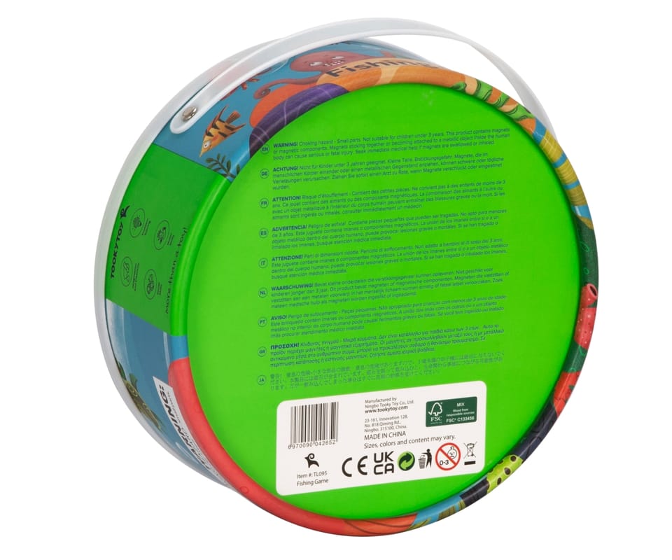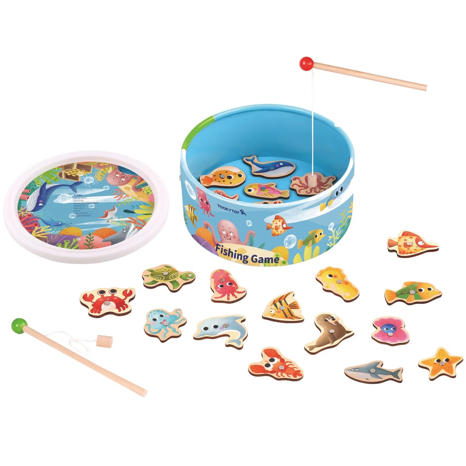 Tooky Toy TL095 to kolorowa gra zręcznościowa dla dzieci w formie magicznego łowiska. W zestawie znajduje się bajecznie ilustrowane, okrągłe wiaderko (imitujące akwarium), 22 elementy w postaci morskich stworzeń (ryby, krab, ośmiornica, żółw, rekin, itp.), oraz dwie drewniane wędki z magnesami. Każdy morski stworek posiada metalowy element, który umożliwia "złowienie" go przy pomocy wędki.Zasady zabawy:Dziecko za pomocą wędki stara się złowić morskie stworzonka z wnętrza "akwarium". Może grać samodzielnie lub z drugą osobą — wtedy wygrywa ten, kto złowi więcej rybek.Możliwości zabawy: