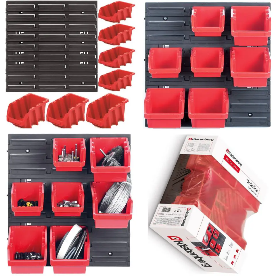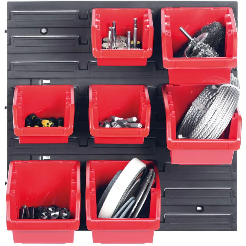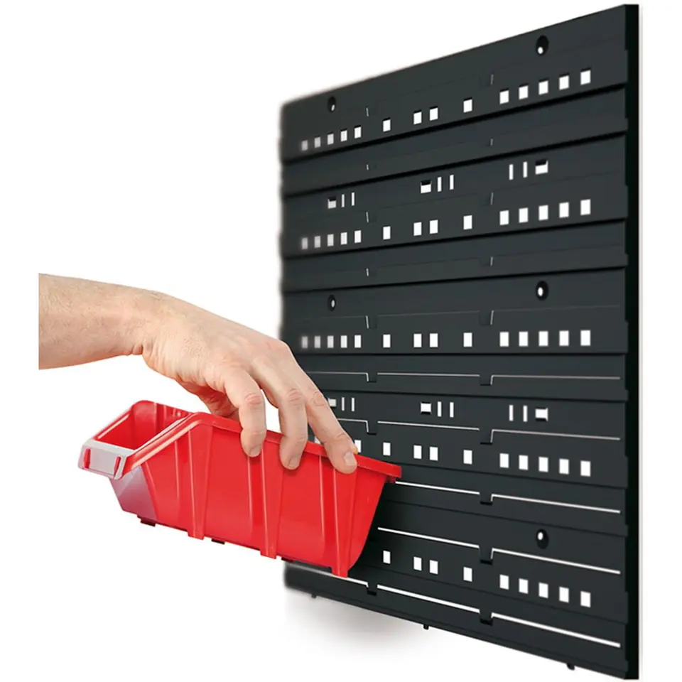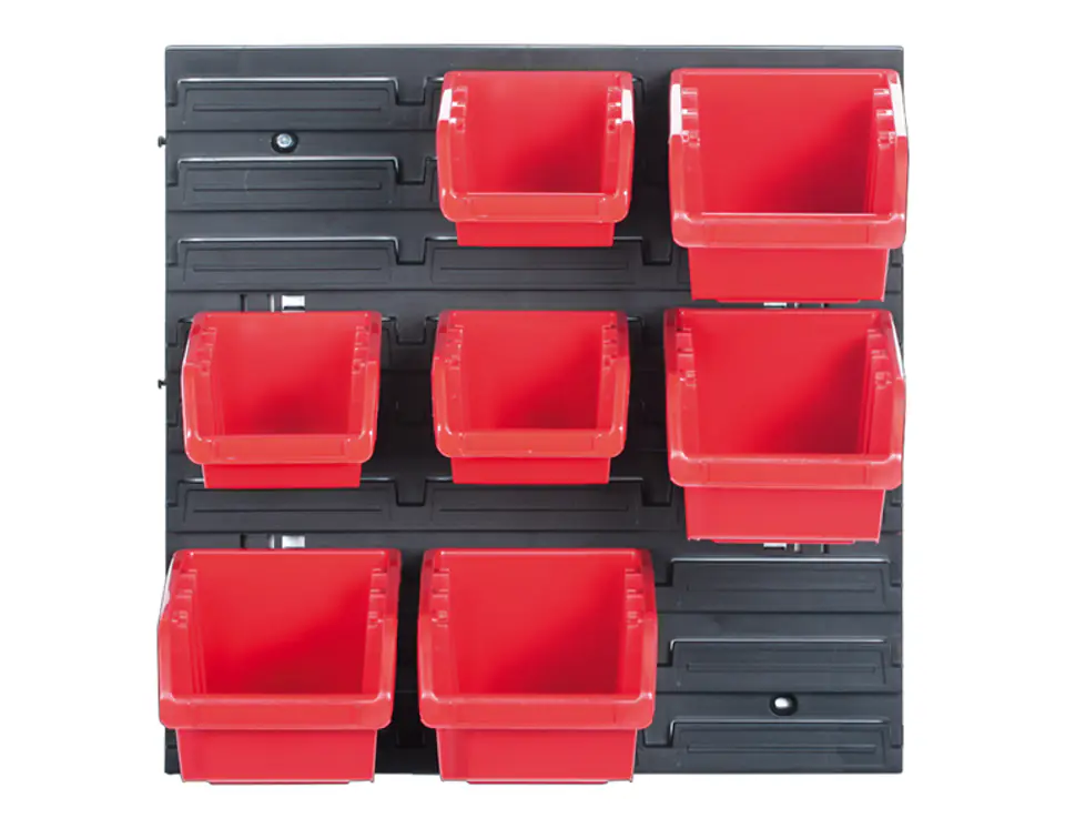 A set of KOR5 workshop boards and containers, designed for any arrangement of workshop or storage space. The set greatly facilitates the problem of organizing small parts and components in workshops and garages. The set includes a wall board and 7 containers in 2 different sizes. The containers are made of a resistant and durable polymer mixture.