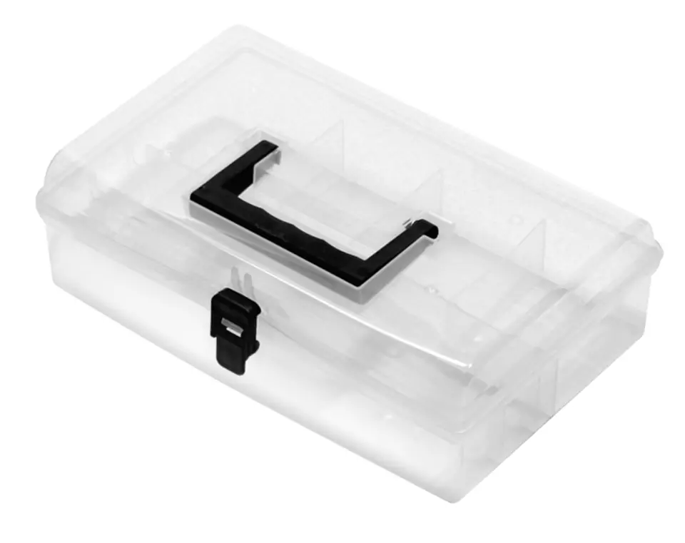 Transparent tool box with closure and handle, made of plastic. Equipped with 5 compartments in two sizes, allowing you to organize elements of different sizes. The transparent housing allows you to look inside the organizer without opening the lid.