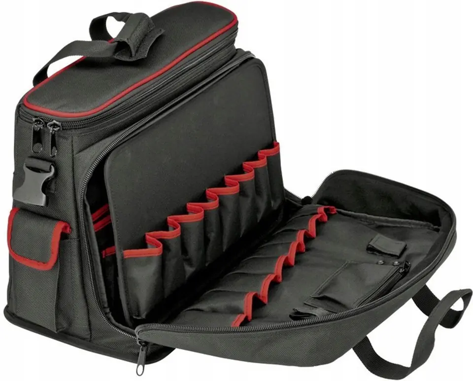 The back side of the outer pocket has 5 tool holders and 3 pen holders