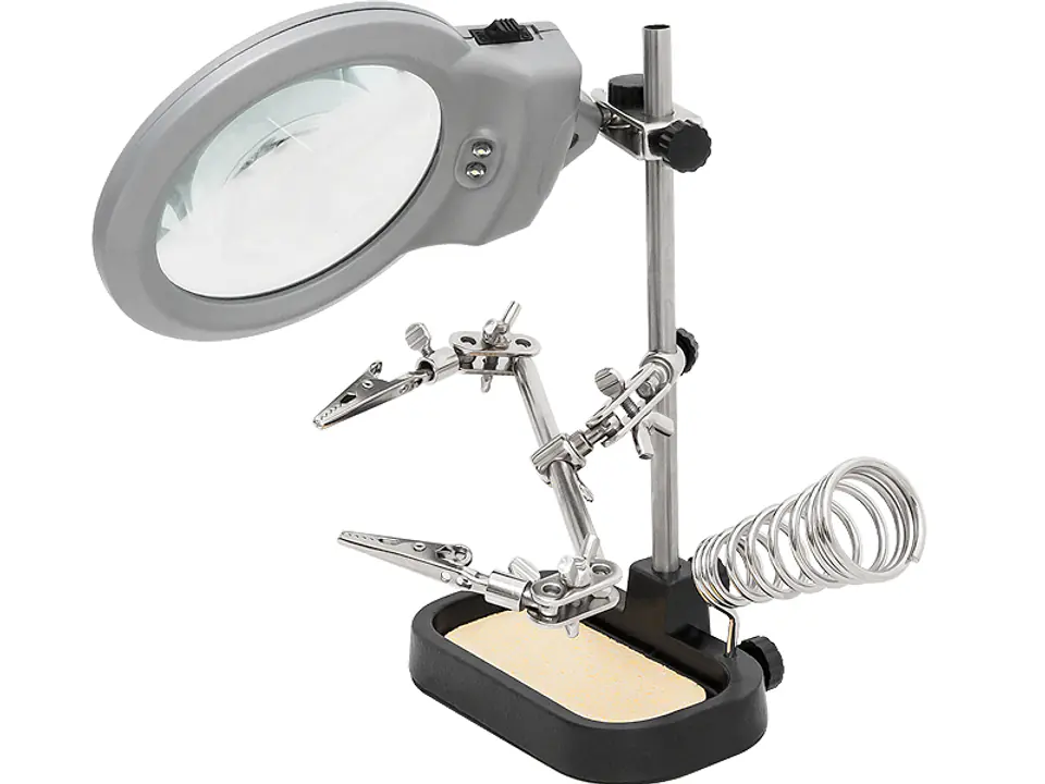 A set of tools to facilitate soldering and other precise installation and electronic activities. In the base there is a sponge for cleaning the tip and a solid holder for soldering irons. There are also two "crocodile" handles and a wide magnifying glass with the possibility of backlighting. Large design possibilities allow you to adjust the settings to your needs .
