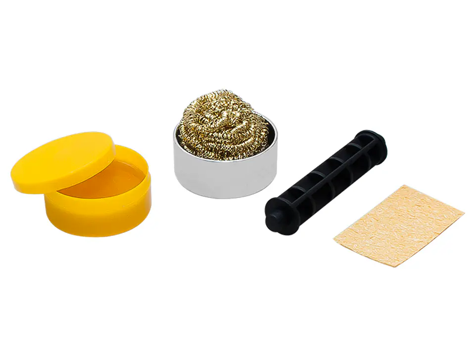The device is equipped with crocodile clips for holding, soldering iron holder, sponges, rosin, cleaning machine for tips