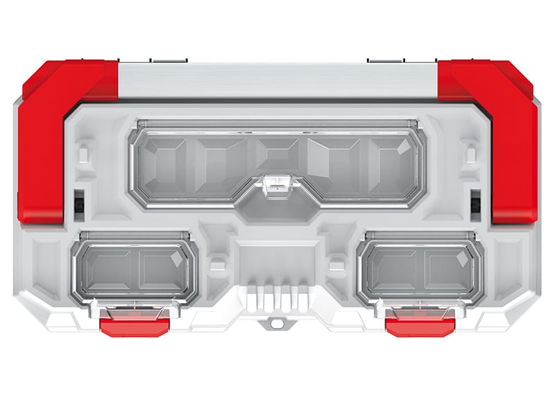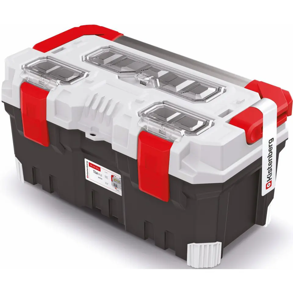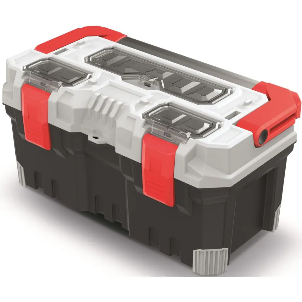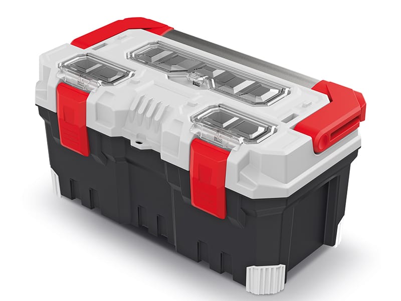 Large capacious toolbox for small and large tools. The body of the box is specially reinforced and additionally with secured elastomer corners. Box with transparent transparent organizer in the lid. The ability to control small accessories even better. Great, roomy tool carrier inside the box. Durable, solid aluminum handle for better transport of the box and for this FASTENING with ABS. Excellent choice.