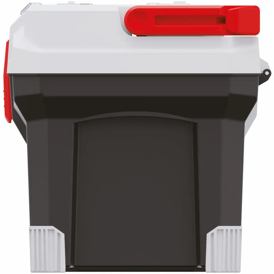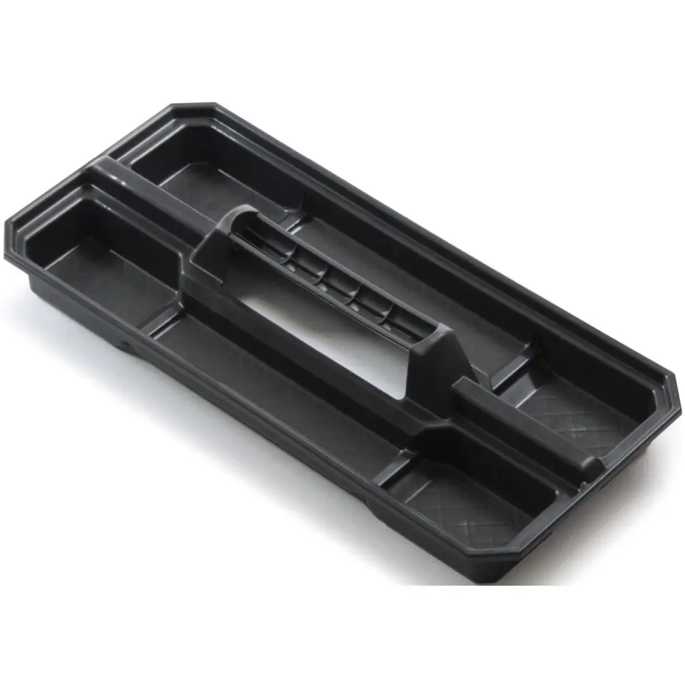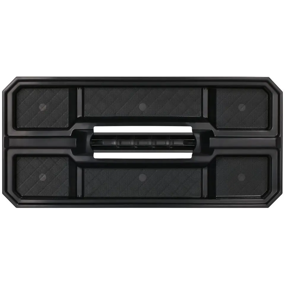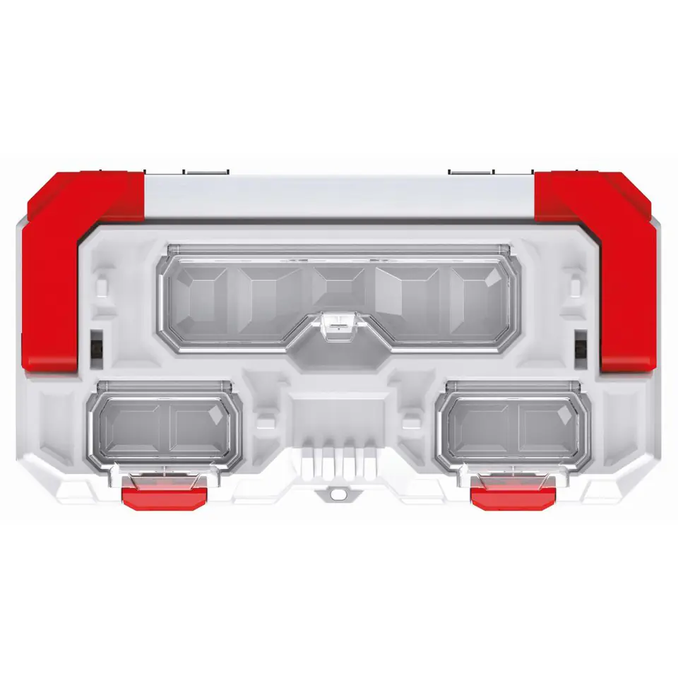 Large capacious toolbox for small and large tools. The body of the box is specially reinforced and additionally with secured elastomer corners. Box with transparent transparent organizer in the lid. The ability to control small accessories even better. Great, roomy tool carrier inside the box. Durable, solid aluminum handle for better transport of the box and for this FASTENING with ABS. Excellent choice.