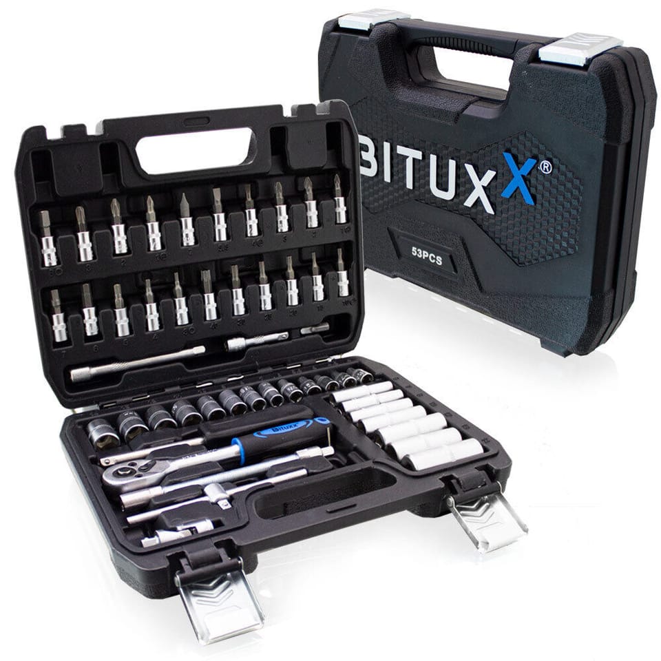 The robust toolset of 45 pieces includes bits, caps, ratchet wrench and additional accessories made of durable, chrome-vanadium tool steel.
