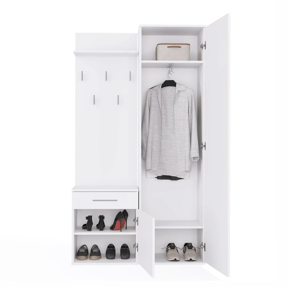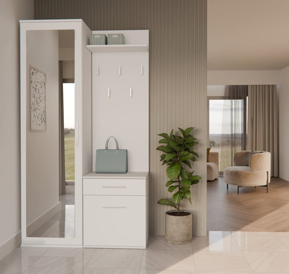 - Szafę z lustrem, szafkę oraz wieszak można zamontować blisko siebie, jak i zarówno rozsunąć.