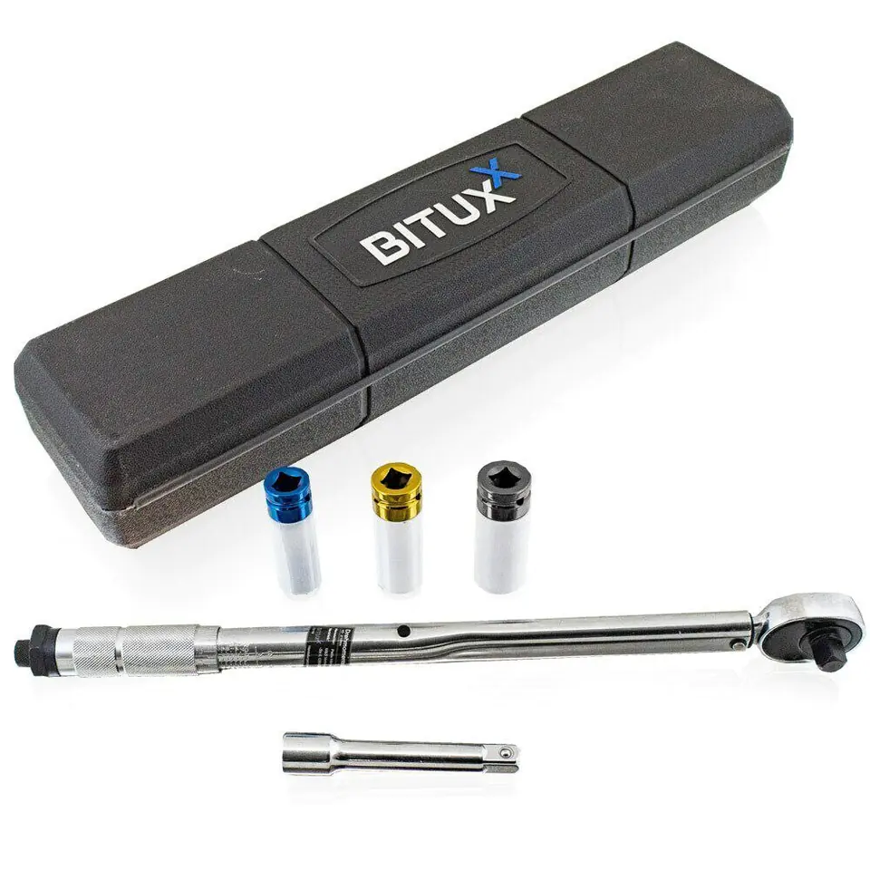 This torque wrench set is extremely easy to use and precisely measures the moment of force. The wrench is made of high quality materials, resistant chrome-vanadium steel, guarantees a long service life. The impact caps included will make it easy to adjust the screws in terms of size. The 1/2" nuts have a removable rim cover. The wrench consists of a head with a square stem and a force transfer arm. The head is used for fixing hexagonal sockets.