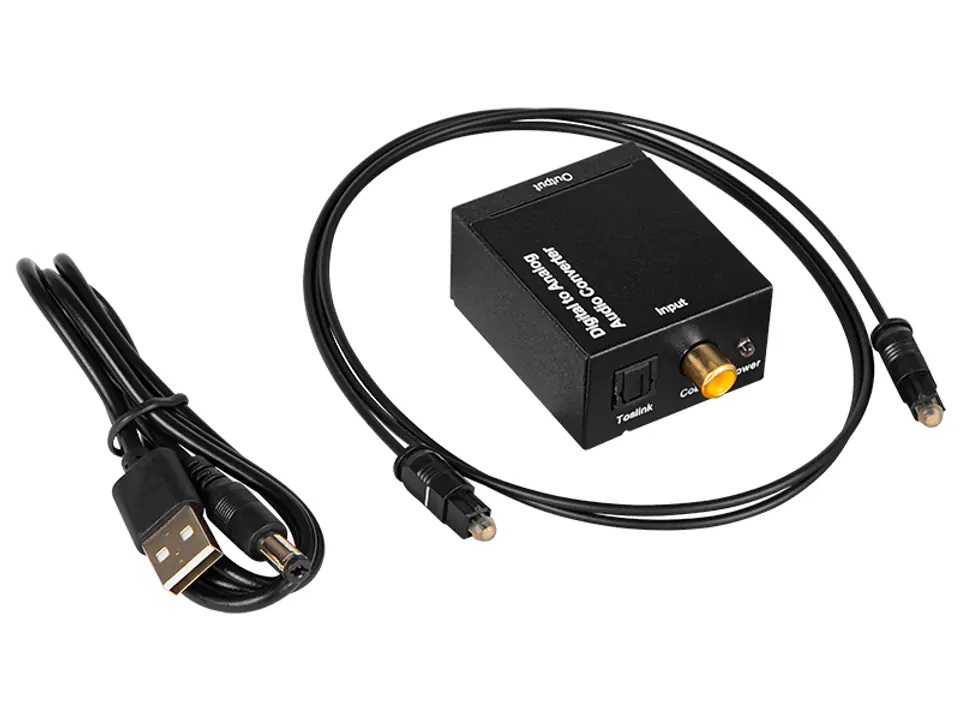 This digital analog audio converter is designed for home or professional audio switching. It converts Coaxial or Toslink digital signals to analog L/R audio and allows you to connect to an external device, such as a TV, via a standard RCA type jack. This converter has a small size and is easy to install.