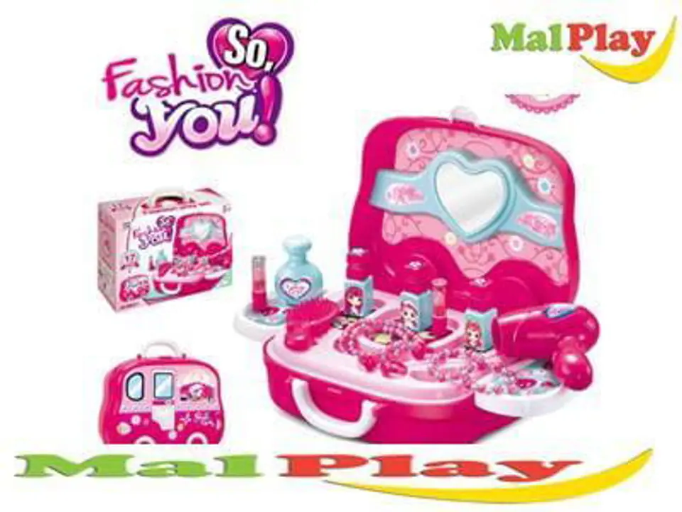 Dressing table in a suitcase Dimensions of the suitcase: 26x20x9cm Unfolded size: 26x20x25 Included: suitcase, sticker set, necklace, rings, bracelets, nail polish bottles, plastic lipsticks, hair dryer, hairbrush, mirror, perfume bottle.
