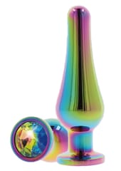 TOYJOY Twilight Bum Bijou Medium to wspaniała zatyczka analna najwyższej jakości, która ożywi Twoje intymne chwile kolorowym blaskiem! Ta elegancka wtyczka posiada zwężającą się sylwetkę oraz rozszerzoną podstawę, która zdobi tęczowy klejnot. Wykonany z aluminium, Twilight Bum Bijou jest gładki w dotyku oraz w pełni bezpieczny dla Twojego ciała. To niezbędny element kolekcji Anal Play od TOYJOY. Jest to doskonała unisexowa wtyczka, która doda Twoim analnym przygodom efektu glamour i kolorowego uroku.