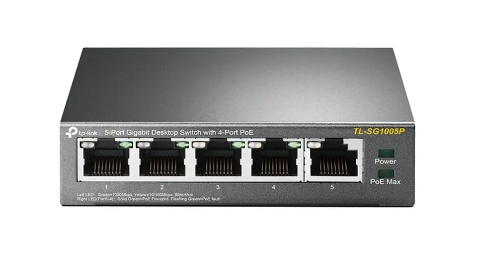 Przełącznik PoE TL-SG1005P posiada 5 portów RJ45 o prędkości 10/100/1000Mb/s, nie wymagających konfiguracji. 4 z nich (1-4) obsługują funkcję Power over Ethernet (PoE). Przełącznik automatycznie wykrywa urządzenia PD działające w standardzie IEEE 802.3af i zaopatruje je w energię. Pozwala to rozszerzyć zasięg sieci w miejscach, w których nie ma dostępu do gniazd lub linii zasilających, a gdzie istnieje potrzeba umieszczenia punktów dostępowych, kamer IP, telefonów IP, itp. Power over Ethernet Przełącznik posiada 5 portów RJ45 z funkcją automatycznej negocjacji szybkości połączeń. 4 z nich (1-4) obsługują funkcję Power over Ethernet (PoE). Przełącznik automatycznie wykrywa urządzenia PD działające w standardzie IEEE 802.3af i zaopatruje je w energię Zapobieganie przeciążeniom Przełącznik posiada funkcję priorytetowania, dzięki której zabezpiecza system w momentach przeciążenia. Pobór mocy urządzeń zasilanych poprzez PoE wynosi do 58W. Urządzenia podłączone do portów o wyższym priorytecie zasilane są w pierwszej kolejności. Priorytetowanie portów Priorytety portów: port-1>port-2>port-3>port-4. Funkcja ta zabezpiecza system w momentach przeciążenia. Np. porty 1,2 i 4 pobierają po 15,4W (maksymalna wartość dla portu wynosi 15,4W), wówczas system wykorzystuje 46,2W (dioda LED PoE zaświeci się na czerwono). Jeżeli do portu 3 podłączone zostanie urządzenie pobierające 12W, system odetnie zasilanie od portu 4. Port 1 i 2 będą więc zasilane 15,4W, port 3 - 12W, natomiast port 4 zostanie odłączony od zasilania. Prosta obsługa Przełącznik TL-SG1005P jest prosty w instalacji i obsłudze. Nie wymagana konfiguracja ani montażu. Dzięki niezawodności i zapewnieniu wysokiej jakości transmisji, 5 portowy przełącznik typu desktop TL-SG1005P z czterema portami PoE stanowi idealne rozwiązanie do rozbudowy domowej lub biurowej sieci