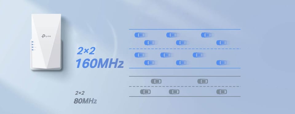 Uniwersalny wzmacniacz sieci bezprzewodowej TP-Link RE700X oferuje wysoką wydajność i niskie opóźnienia. Korzystaj z większej przepustowości i wyższej prędkości niż na standardowych 80MHz, dzięki obsłudze 2x2 160MHz w paśmie 5GHz. Oddzielne pasma WiFi: 5 GHz (2402 Mb/s) i 2,4 GHz (574 Mb/s) pozwalają uzyskać wyższe prędkości i większą pojemność sieci dzięki najnowszej technologii.