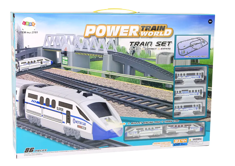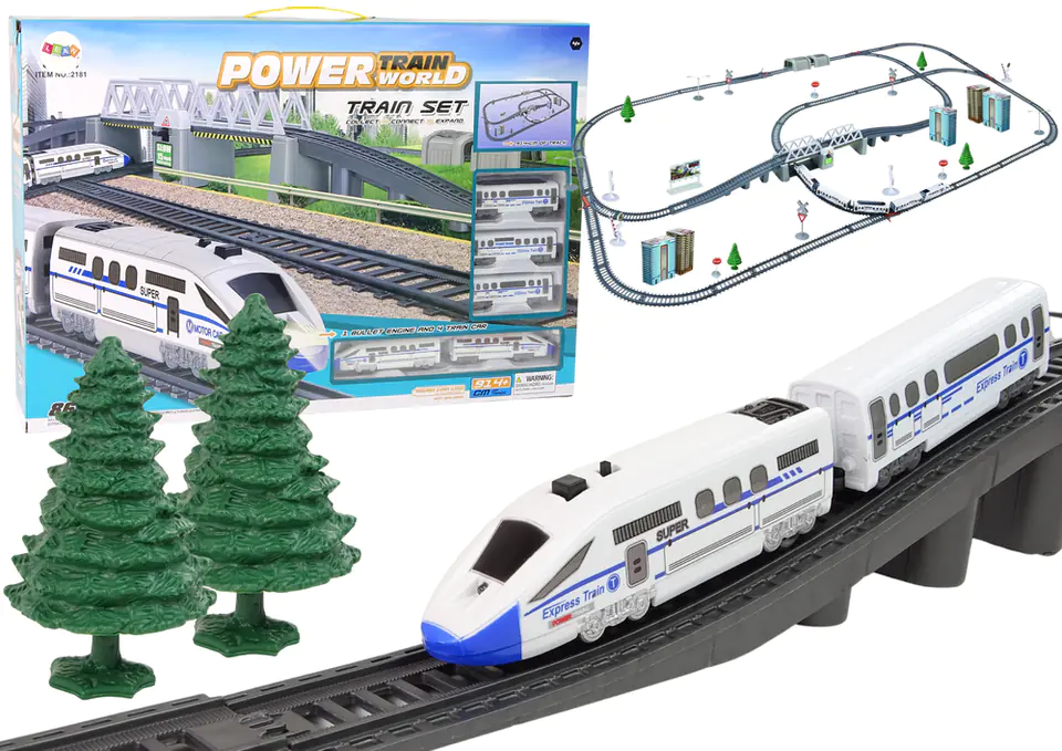 The railway building kit includes a fantastic assortment of tracks, building elements and accessories. Among them are straight and curved tracks, trees, road signs. You can build a huge city.
