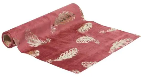 Edeltured tablecloth with an embossed pattern in velvet feathers 150cm Pattern:1 Tread is the perfect way to turn your daily evening meal into a real event or beautifully decorate a festive tablecloth. A tasteful addition in an expressive color with large golden feathers gives any dinner a touch of elegance. The velvet tread combines with a contrasting background: put it on a pastel tablecloth, and you will be satisfied with the effect. The tread will complement the festive setting of the table and will be a graceful accent of the upcoming celebration. This aesthetic addition can turn any meal into a small celebration. This tablecloth can be combined with dishes and napkins of a contrasting color or spread out on an ordinary tablecloth. Specification: Material composition: velvet Dimensions: 150 x 28 cm Color: powder pink, champagne gold