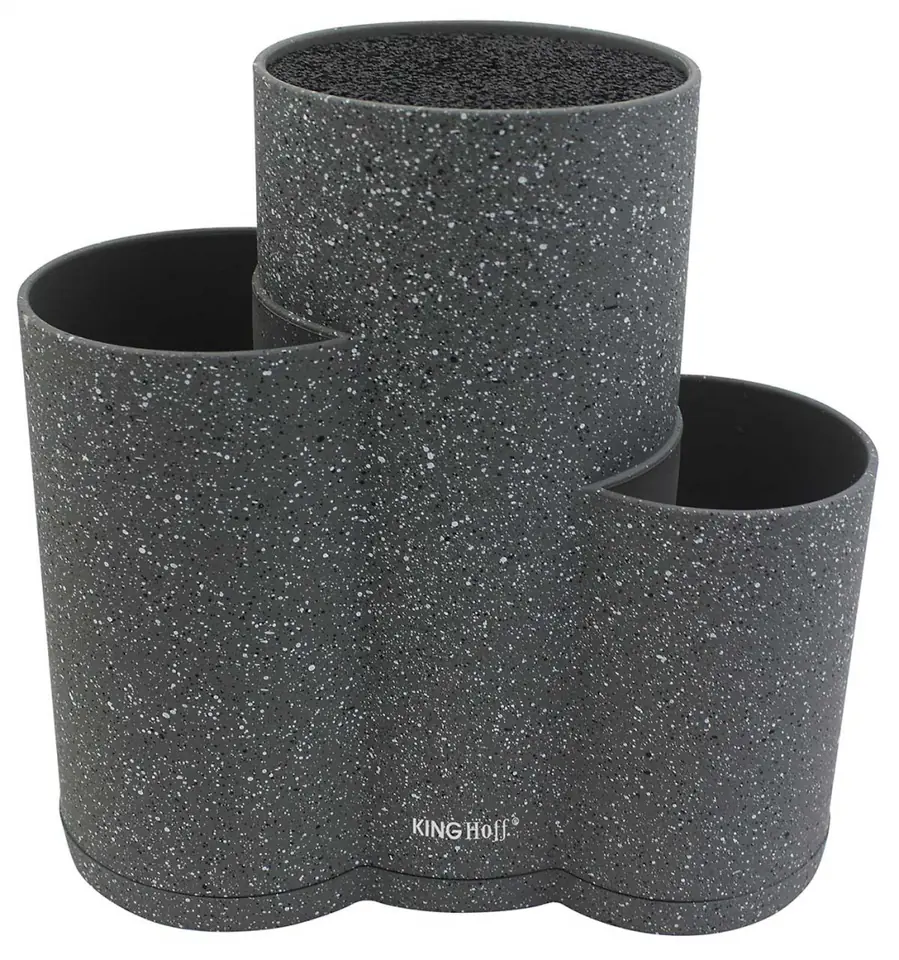Triple block stand for knives and kitchen utensils. The block is filled with plastic stamens. Thanks to this, it is possible to store knives of different thickness, width and length in them. The remaining 2 compartments can be used freely for kitchen utensils and accessories.