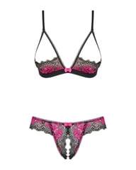 Delightful, black and pink lingerie from the Tulia line, with an open-cup bra and open thongs. Extremely sexy, and at the same time with a unique, lace charm. What does this underwear offer? Adjustable straps, multi-step bra fastening, soft finishes and a beautiful, floral décor combined with an extremely sensual construction. Composition: 90% polyamide, 10% elastane.