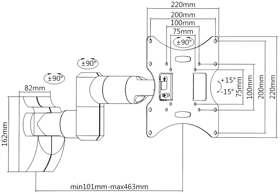 It has easy adjustment of the tilt of the panel vertically within ±15° and horizontal rotation on 3 joints by 180° each