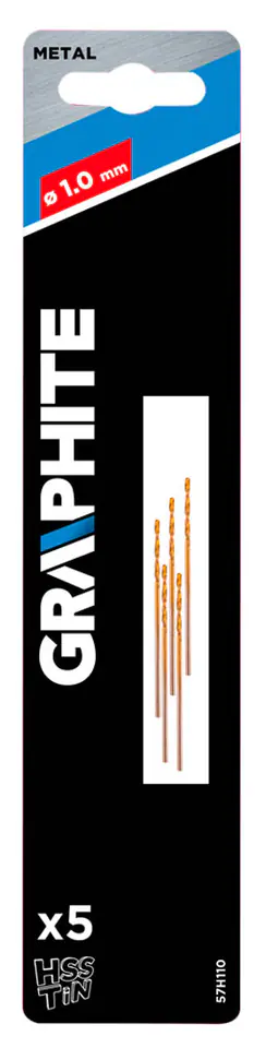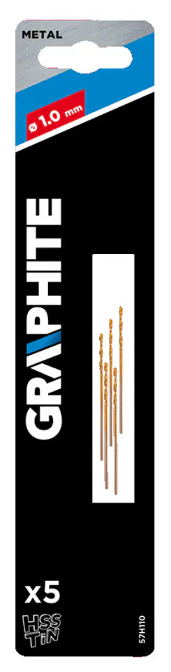 GRAPHITE metal drill bits (ref. no. 57H110) with a diameter of 1.0 mm, made of high-speed steel alloy 9341. Additional coating with a layer of titanium nitride allows to reduce cutting resistance and maintain high quality drilled holes, especially when drilling holes with drilling machines. The 135° apical angle and shear correction allow easy drilling of holes without scoring. They are ideal for drilling in steel, cast iron, elements made of non-ferrous metals (copper, aluminum, brass).