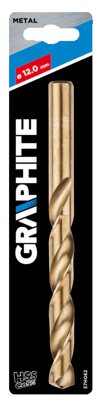 GRAPHITE metal drill bits (Ref. 57H062) with a diameter of 12.0 mm are made of a high-quality alloy of high-speed steel M35 with 5% cobalt addition. The 135° apical angle and shear correction allow easy drilling of holes without scoring. Thanks to the high temperature resistance of the alloy, they are ideal for drilling holes in hard-to-machine materials such as stainless steel, acid-resistant steel, heat-resistant steel, etc.