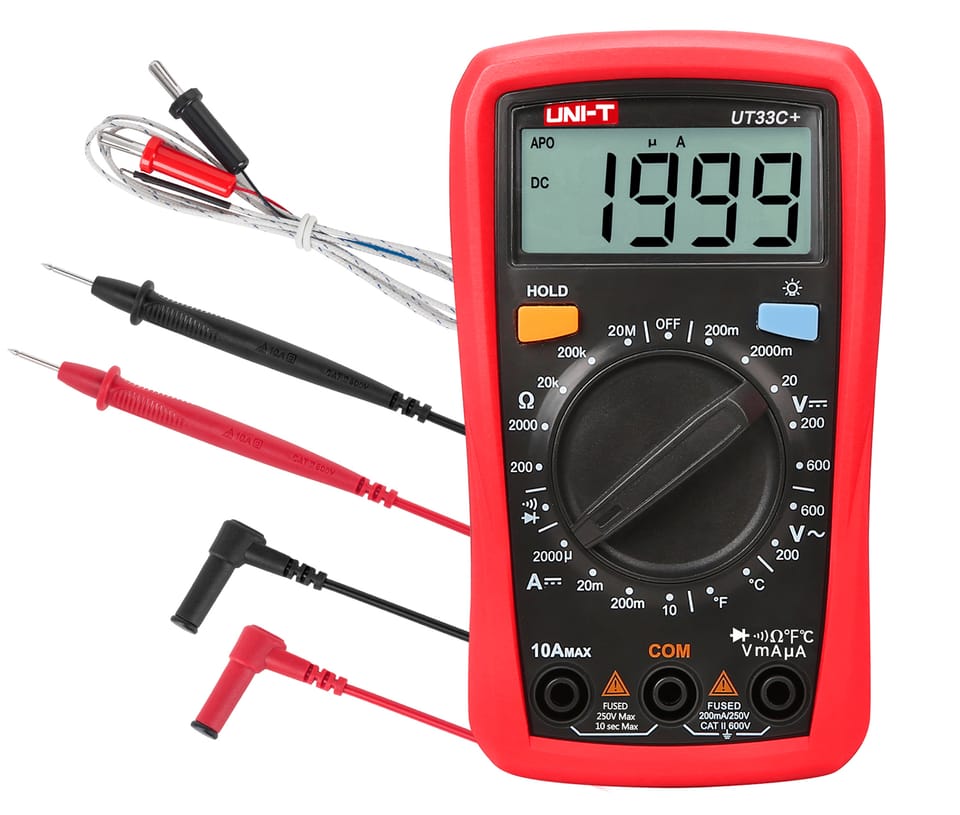 MEASURING RANGEDC voltage: 200 mV / 2000 mV / 20 V / 200 V / 600 V ? (0,5%+2) AC voltage: 200 V / 600 V ? (1,2%+3) DC current: 2000 ? A / 20 mA / 200 mA / 10 A ? (1%+2) Resistance: 200 Ohm / 2000 Ohm / 20 kOhm / 200 kOhm / 20 MOhm ? (0,8%+2) Temperature: -40°C~1000°C (1%+4) / -40°F~1832°F (1.5%+5)DIODE testChecking circuit continuity ADDITIONAL FUNCTIONSManual change of measurement ranges Freezing the last indicationLower indicatorMaximum reading: 2000Exposed LCD screenGENERAL SPECIFICATIONSDIRECT voltage input impedance: about 10 MOhmPower: battery 2x 1.5 V battery (R03)Display size: 48 x 16 mm Product dimensions: 134 x 77 x 47 mmProduct weight: 206 gAccessories: Batteries, test leads, holster