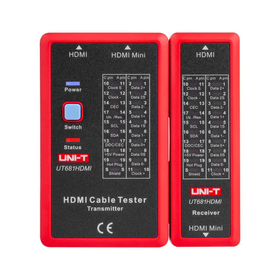 Purpose: HDMI cables, mini HDMIThe number of scanned lines: LED1~LED19, quick scan LED_STest/full scan test: LED1~LED19, LED_STest for short circuit, circuit break, cable crossover, etc. Manual/auto power offGENERAL FEATURESPower: 9 V BatteryLow battery: Less than 7.2 VDimensions: 102 x 62 x 28 mm transmitter; 102 x 37 x 28 mm receiverWeight: 87 g transmitter; receiver 51 gENVironmental Temperature and Humidity: 0~40°C; 20~80%RHTemperature and Humidity: -10~50°C; 10~90%RHOperating Height: Max. 2000 m a.s.l.m.Certificates: CE EN61326-1: 2013; EN61326-2-2: 2013Accessory: 9 V battery
