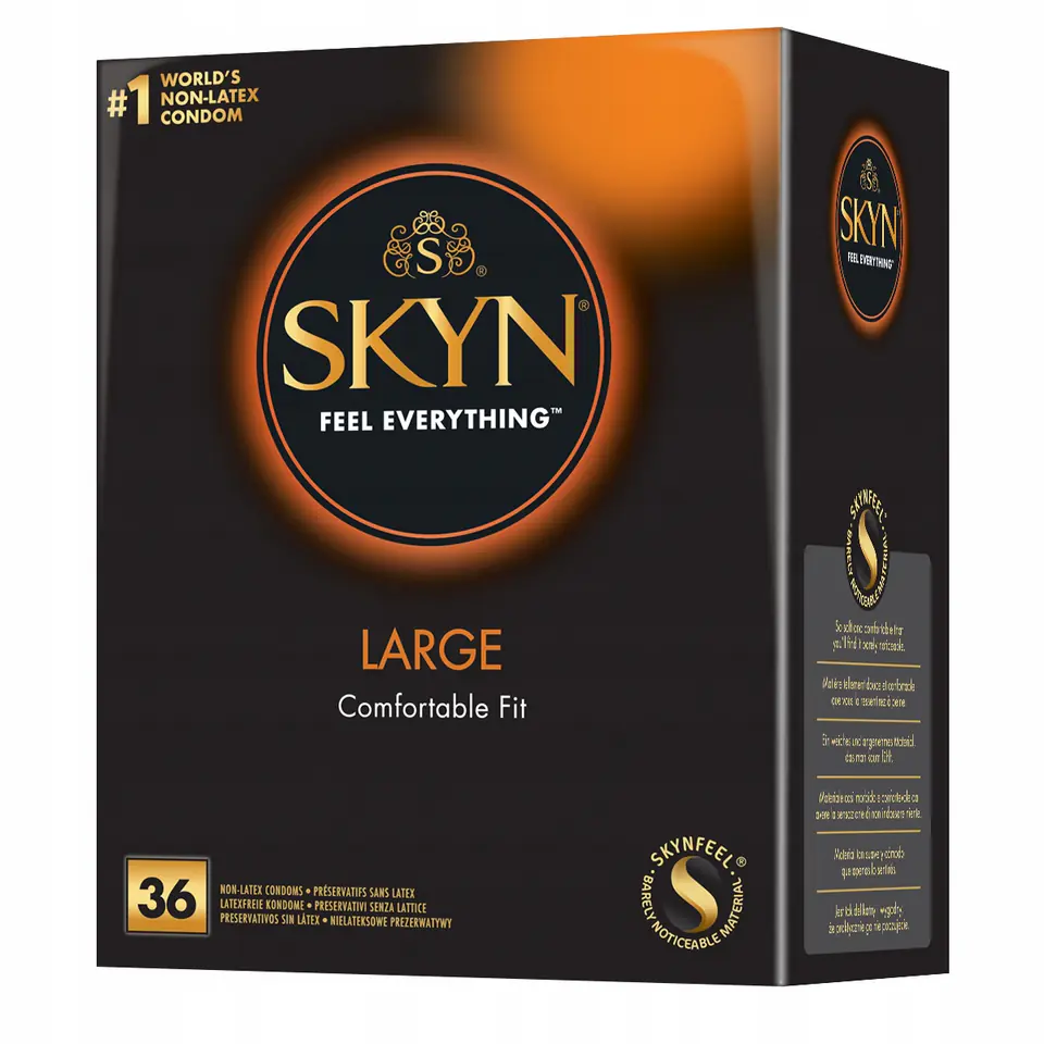 SKYN Large Ultra-Thin Premium Polyisoprene Lubricated Condoms are made with SKYNFEEL material, a non-latex material that feels soft and natural. 15% thinner than our SKYN Original condoms, and longer and wider for more comfort, these condoms provide ultimate sensitivity. They are also ultra-soft and easily stretch to your shape so that they are comfortable to use. All SKYN condoms are free from natural rubber proteins, making them a suitable choice for people with known or suspected latex allergy.