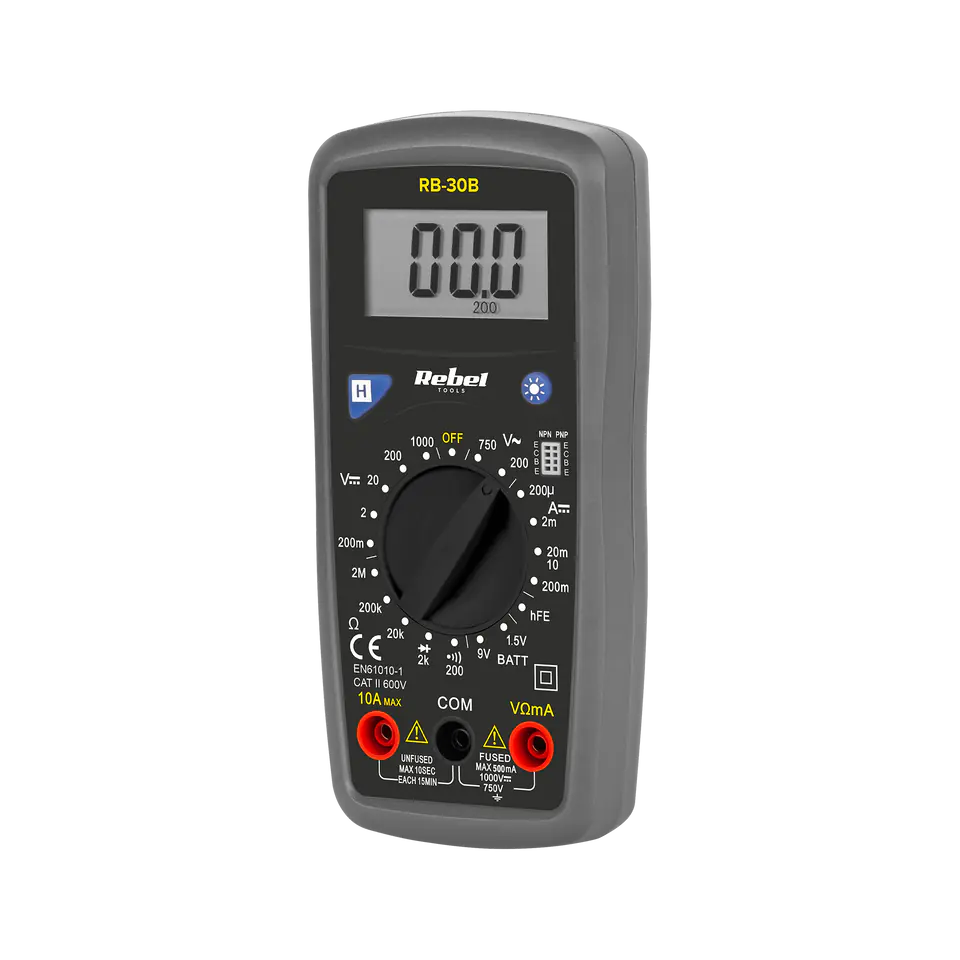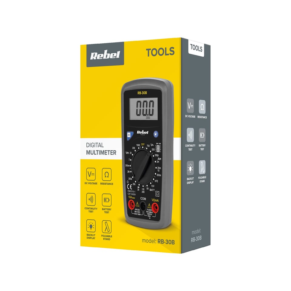 The Rebel Tools RB-30B Rebel Tools universal meter is primarily a device that is designed to help DIY enthusiasts who want to do minor renovation work on their own. Bearing in mind that good power tools are not everything, this series has been extended with a number of measuring devices. Among them are universal and clamp meters, whose functions allow you to measure various physical values, including voltage and amperage of direct and alternating current, which will allow, for example, to detect a fault in the electrical installation. What's more, depending on the model, Rebel Tools multimeters allow you to measure the temperature of an object, check the continuity of the circuit or test diodes and hFE transistors. Don't need a multifunctional device? Choose from two voltage indicator models that allow you to measure AC/DC voltage.