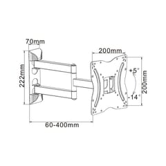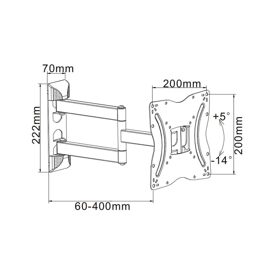 Screen size: 13"~43" for new types of TVs can be used up to 55" inches. Maximum load: 30 kg/66 lbsVESA:75x75, 100x100, 200x100, 200x200Adist adjustment: +3°/-10°Horizontal adjustment: +90°/-90°Wall distance: 56~415 mmColor: black