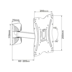 Screen Size: 13"~42"Maximum Load: 30 kg/66 lbsVESA: 75x75, 100x100, 200x100, 200x200Adist adjustment: -10°/+3°Horizontal adjustment: +90°/-90°Wall distance: 56~205 mmColor: black