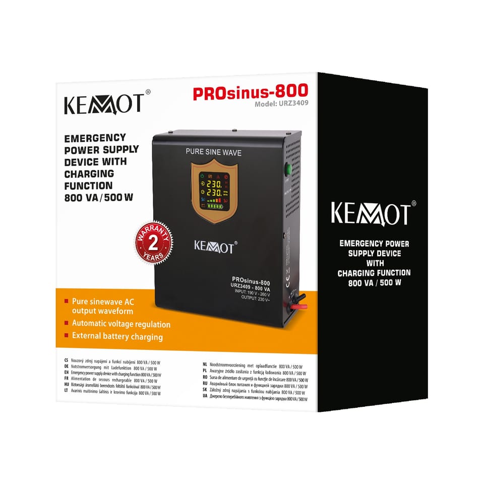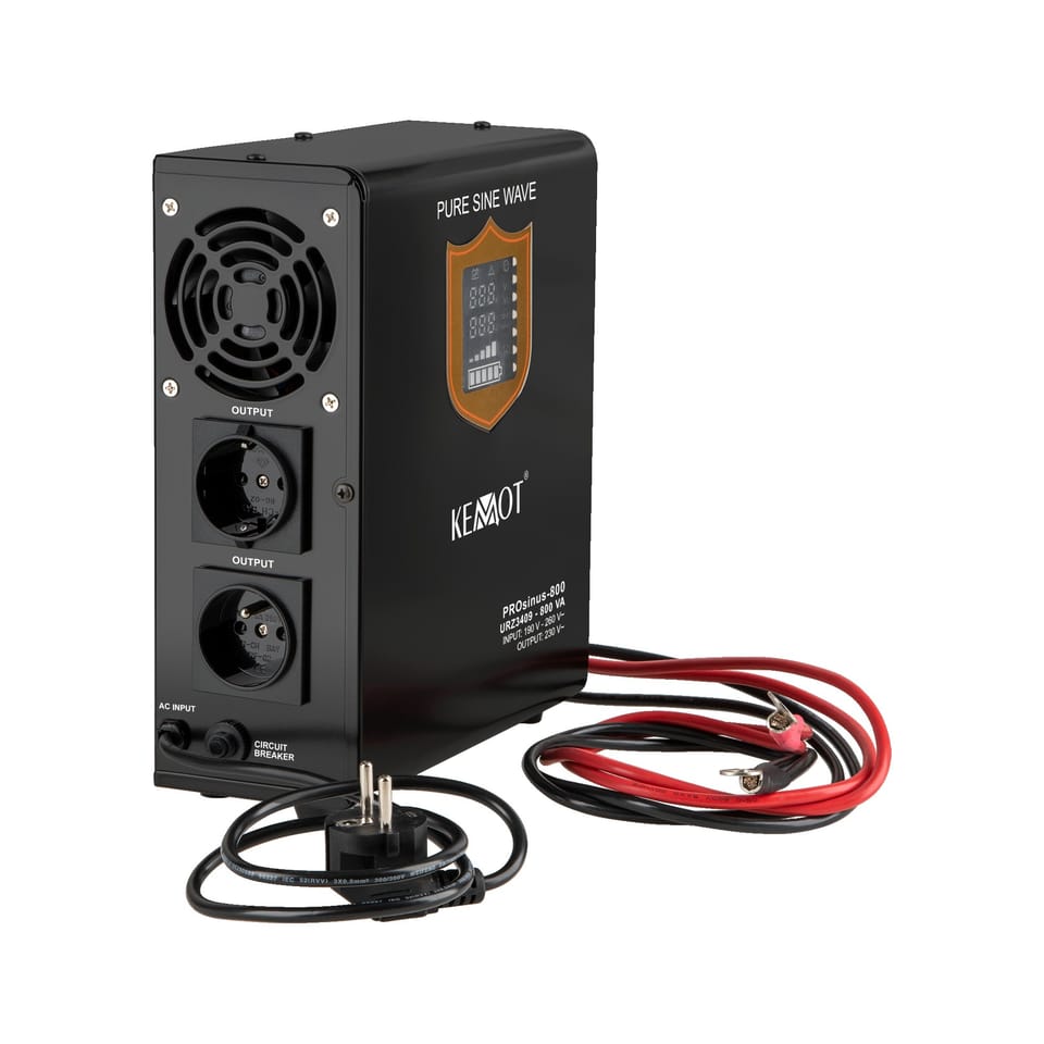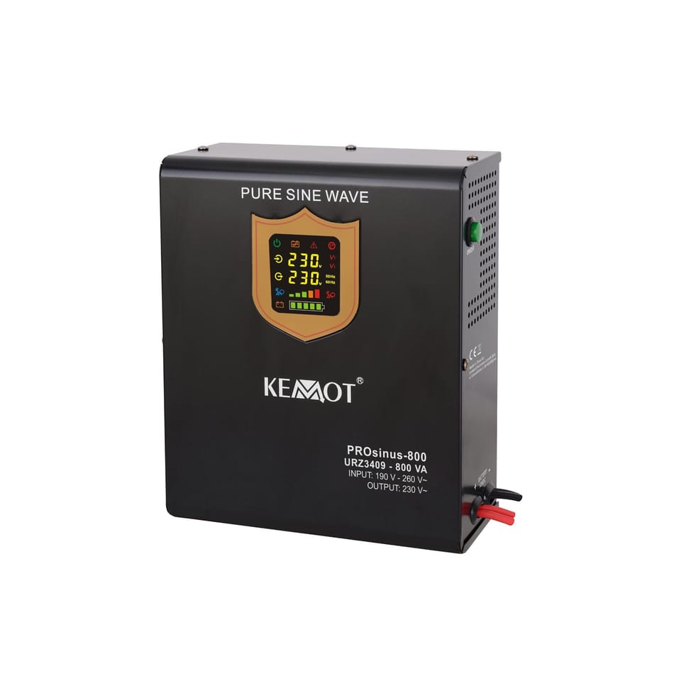 KEMOT emergency power supply systems are used to protect selected devices against power disturbances, the consequence of which may be a disturbance or interruption of their operation. The KEMOT PROsinus series of devices is perfect for powering e.g. central heating pumps or pumps in fireplace installations, as well as induction motors, or e.g. installation automation devices using heat convectors and any devices extremely sensitive to the slightest changes in the shape of voltage. Their advantage is a pure sinusoidal course of the output voltage (supplying the receivers), thanks to which the device ensures stable operation, preventing the effect of overheating of induction receivers. Together with the 12V battery, they constitute a complete 230 VAC guaranteed power supply device. The KEMOT PROsinus-500 emergency power source is a drive with pure sine waveform and charging function