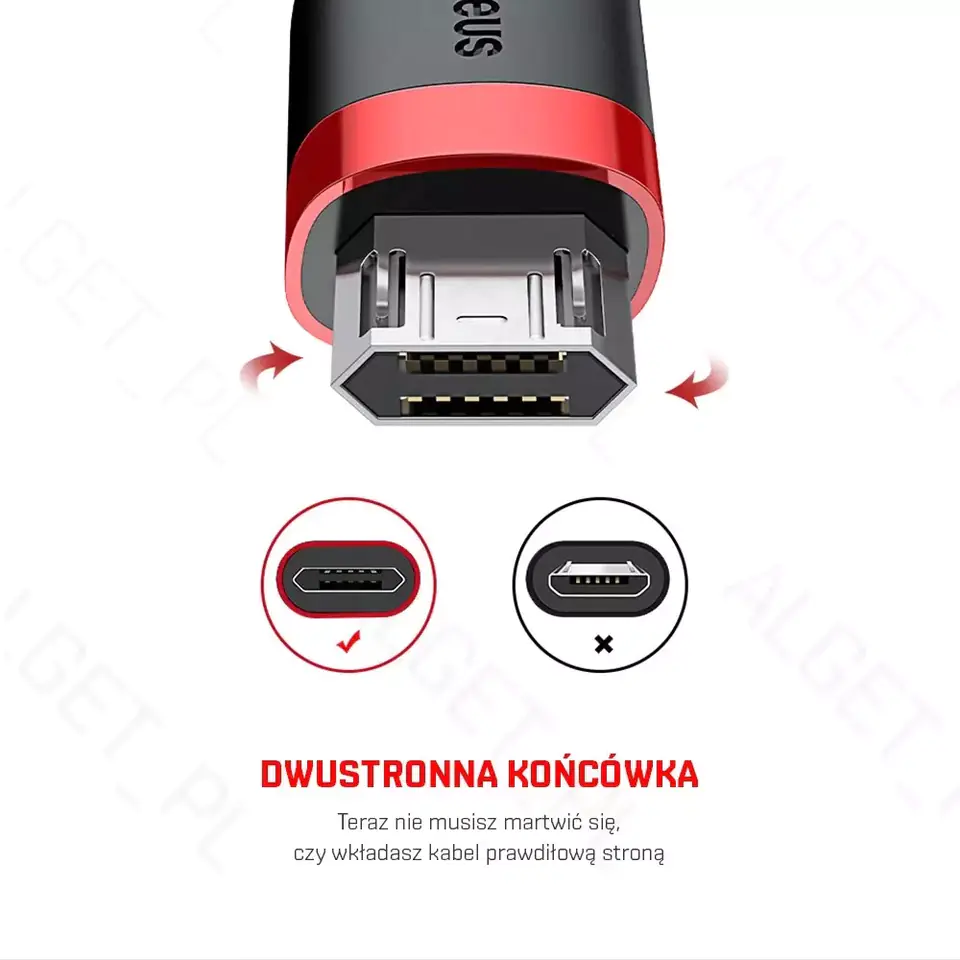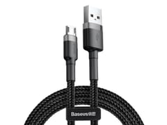 Baseus cable from the Cafule series Baseus USB - micro USB cable with a reinforced design. It supports fast charging and data exchange up to 480mb/s (e.g. with a computer). With a double-sided Micro USB connector, we do not have to worry when connecting the cable to the device. The cable supports Quick Charge 3.0 fast charging. The control chipset adjusts the current to the device, protecting it from damage. The nylon braid strengthens the cable and prevents tangling. It also has a PVC sheath at the point of the cable inlet to the connector housing. Includes a velcro strap for easy cable storage. ManufacturerBaseus SpecificationBaseus ModelBaseus cafule Cable USB For Micro 2.4A 1M Gray+Black MaterialTPE, aluminum, nylon Length100 cm Output currentup to 2.4A ColorGrey - Black Compatibility Micro USB Port Devices