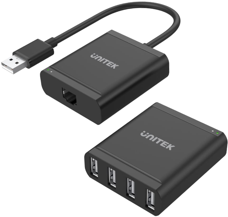 Up to 4 different USB devices can be connected. Maximum direct connection length is 60m. The connection is made through standard UTP cable category 5 / 5e / 6. The extension cable supports a USB 2.0 connection, which provides a transfer rate of up to 480 Mbps. We will find a power supply that will be needed when you want to increase performance or connect devices that require more power. The extension cord is Plug & Play and does not need any drivers. The diodes placed at the ports inform the user of the connection status. The USB bus limits the connection to 5 meters, and the specification only provides five times the signal strength of the repeater. Therefore, for USB connections longer than 30 m, an extension cable is required, which uses a common twisted pair cable.