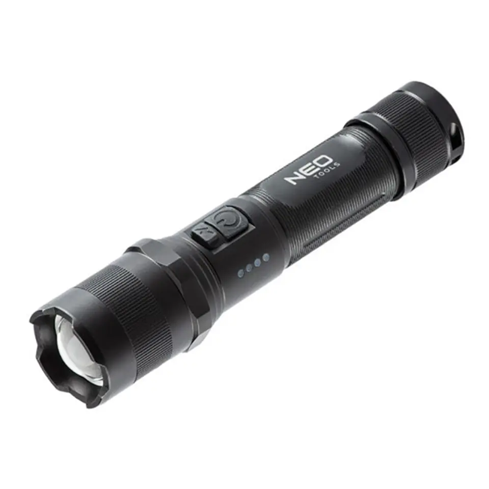 The NEO battery flashlight (ref. no. 99-035) with zoom is equipped with modern OSRAM P9 LEDs with a luminous flux of 1000 lumens and a power of 10W. The maximum range is 250 m. The flashlight is powered by the included 3.7V Li-Ion battery with a capacity of 2200 mAh. The body is made of aluminum. The flashlight has 4 lighting functions: 100%, 40%, 10% and a strobe. A USB cable is included.