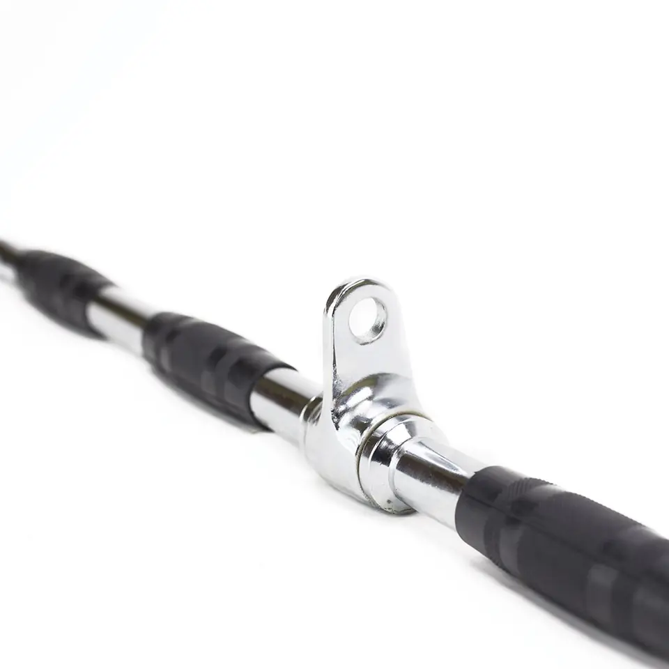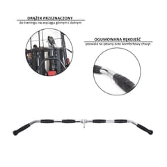 UW14 HMS is a bar designed for training on the upper and lower lift. It can be used for a whole range of exercises for different muscle groups of the upper body, starting from small muscle groups, such as biceps and triceps, through the anterior and lateral acton of the deltoid muscles, to the widest muscles and the back extensor. It is made of high quality steel, which makes it possible to train with a significant load. Its length and the number of rubberized handles guarantee many grip possibilities, from very narrow to very wide. Thanks to this, the handle will allow, with each exercise, to develop muscles on different lengths of their attachments. The extreme handles are set at an angle, which when practicing pulling the bar on the upper lift, promotes the attraction of elbows to the torso, i.e. maintaining the best exercise technique. The handle allows you to perform your workout accurately, without fear of slipping out of your hands. This is ensured by rubberized handles, which also provide a firm and comfortable grip. The UW14 HMS model will help to easily and symmetrically expand muscle parts. Designed for upper and lower lift Specification: Material: chrome plated steel Gripping part length (mm): 110, 150 Gripping part diameter (mm): 32 Number of gripping spots: 6 Handle spacing (mm): 275, 595, 1050 Handle: rubberized Dimensions: length (mm): 40 width (mm): 1180 height (mm): 155 diameter (mm): 25 Bore diameter (mm): 15 Product weight (kg): 4.8 Notes: Warranty 24 months