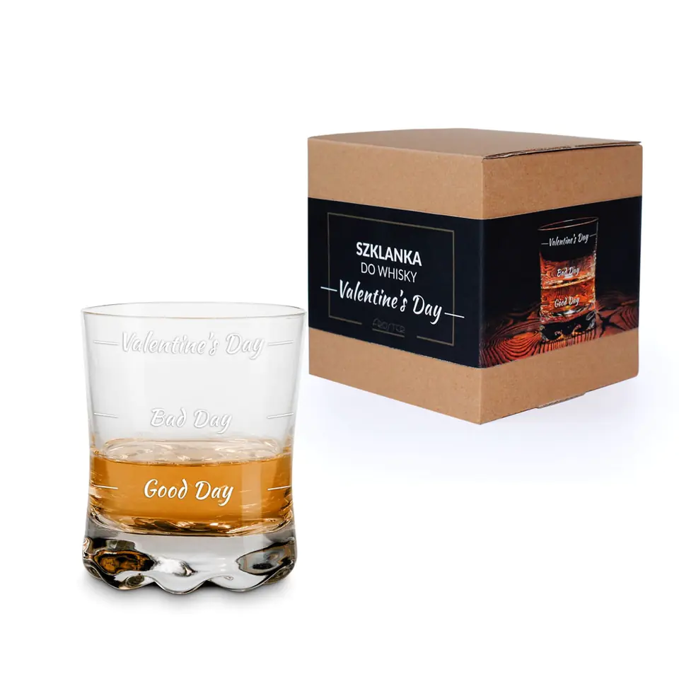 Not everyone has to like Valentine's Day. If your significant other also belongs to this group, do not torture her with sweet hearts! Show that you understand it and have a distance to this day. Give her a practical gadget useful all year round - Valentine's Day whiskey glass, which will make her remember this Valentine's Day for a long time.How to use a Valentine's Day whiskey glass? Valentine's Day whisky glass has three filling levels to help you gain the right distance from reality. On a successful day, fill it to the "Good Day" level and enjoy the moment. When the day is worse, correct it by using the "Bad Day" level. The third level of filling is reserved for this one, special day, which for some sober is unacceptable. If no word can describe the emotions you have for Valentine's Day, fill the glass to the level of "Valentine's Day" and... let the print speak for you. Remember only one thing: you can always reach for this glass, because any reason to drink whiskey is good. And if you want, you can have Valentine's Day all year round! Valentine's Day whisky glass - for what occasions? For Valentine's Day - for whisky fans who do not like Valentine's Day. By giving such a gift, you show that you have a similar sense of humor. A little bit of slack and distance to some things are important in relationships. Such a gesture can make you both feel like celebrating and you can't wait for the next Valentine's Day... For a bachelor party - the life of a man after marriage changes dramatically, and Valentine's Day becomes just a small icing on the cake. A moment of relaxation is a bit more difficult, and the sense of humor counts even more then. That's why Valentine's Day whiskey glass will be the perfect gift for a friend or brother who is about to get married. No occasion - this is a gadget that (regardless of the card in the calendar) will help to relax all whiskey lovers. And for this throughout the year it will arouse admiration in the company, because the second such an original and funny whiskey glass simply does not exist!