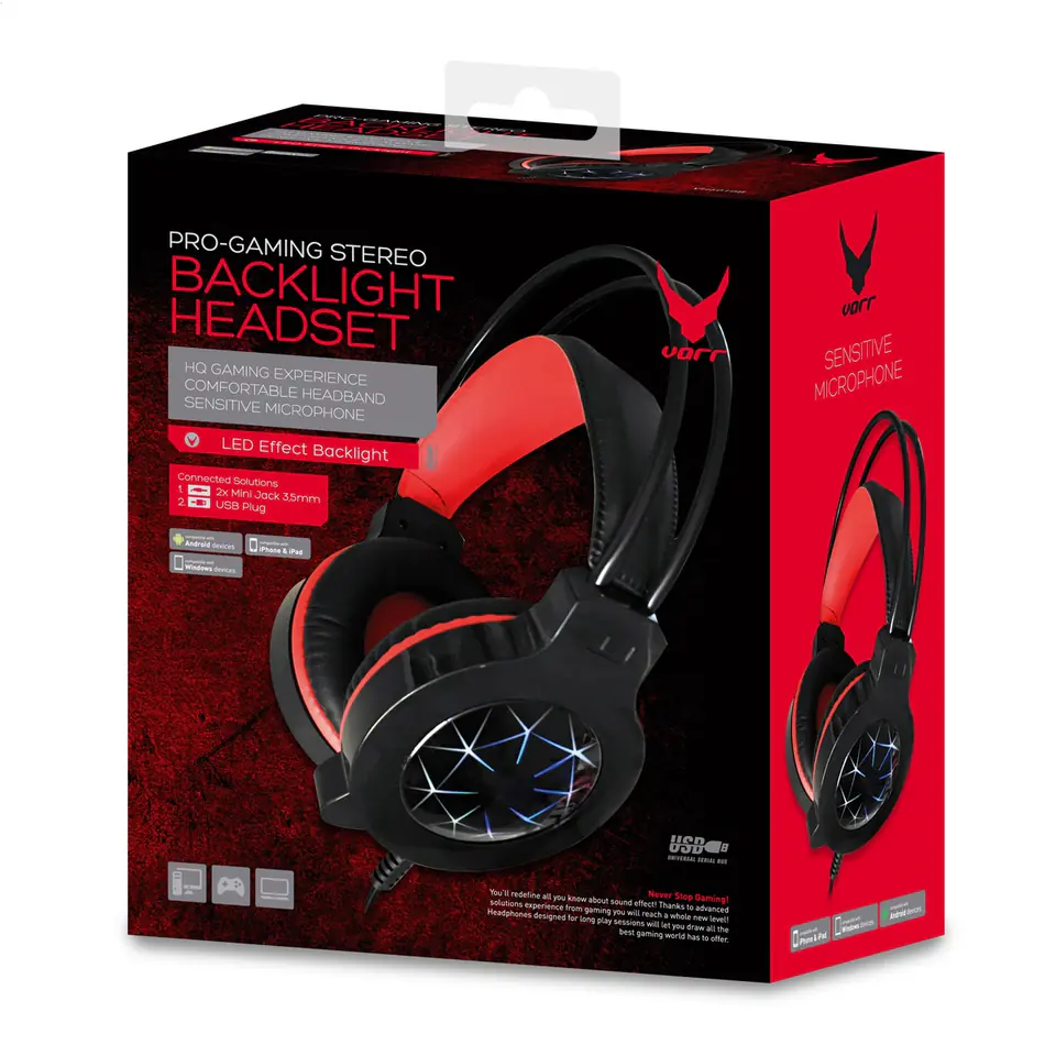 VARR OVER-EAR GAMING HEADPHONES WITH MICROPHONE AND LED BACKLIGHT VH6010BTHE MOST IMPORTANT FEATURES: adjustable headband connecting the earpieces LED illumination around the ear cups built-in, movable and sensitive microphoneRugged headphones for avid gamersA reliable headset for demanding players by VARR, made of the highest quality materials. Comfortable ear muffs and light, ergonomic design ensure comfort during long games.COMMUNICATION AT THE HIGHEST LEVELA sensitive microphone enables communication at the highest level. Voice control is facilitated by a discreet knob built into the headphones.UNFORGETTABLE AUDIOVISUAL IMPRESSIONSIn addition to red accents on the black housing, the visual impression is provided by LED backlight. The round shape of the shell makes it even more comfortable to use.TECHNICAL SPECIFICATIONS:Connectivity: wired (braided cable)Plug types: mini jack microphone and audio, USBCable length: 2.2 mCable circumference: 5 mmPower: 45 mWImpedance: 32?Sensitivity: 108 dB / mWFrequency response: 20-20kHzDiaphragm diameter: 40 mm