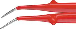 Precision tweezers with finely serrated gripping surfaces and angled tops, insulated