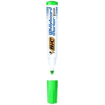 Dry-erase marker Bic Velleda_- Alcohol-based ink, virtually odorless. The polypropylene housing with a diameter of 20mm and a length of 13.8cm contains 4.9g of ink. The locked writing tip does not bend and does not retreat under pressure. Cap and ink-colored tip. Pictograms on the body informing about the purpose of the marker. The ink is easy to remove even after a few days. Velleda 1701 - Round acrylic tip: diameter 6mm; Line width 1.5mm. Velleda 1751 _ beveled acrylic tip : writing line width 3,7 mm _ 5,5 mm. Indication of the manufacturer and country of origin on the body