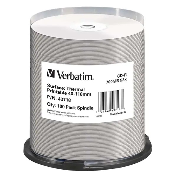Verbatim CD-R, 43718, Thermal Printable - No ID Brand, 100-pack, 700MB, 52x, 80min., 12cm, spindle, archiving