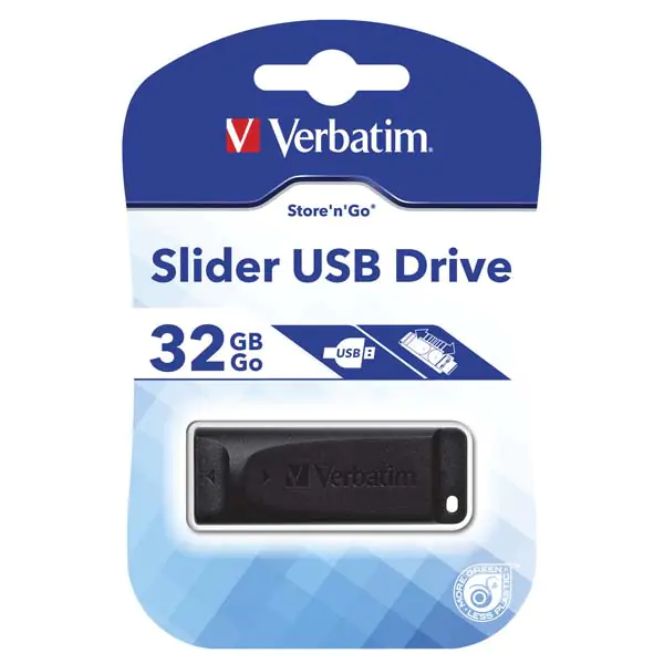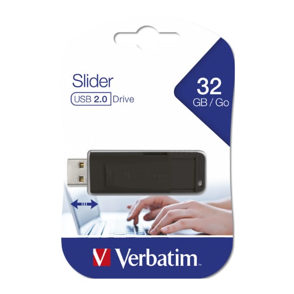 With USB ports in almost every computer and popping up in cars, DVD and multimedia players, TV's, photo frames and more, USB drives are now being considered an essential accessory.The Slider USB Drive from Verbatim has a retractable sliding mechanism which protects the USB connection when it is not in use.Simple and easy to use, just slide open the cap, plug into any USB 2.0 port and drag and drop your folders and files.Capacity: 32GBRetractable sliding mechanism,USB 2.0 interface.System RequirementsUSB 2.0 portWindows 10. 8, 7, Vista, XPMac OS X 10.4 or higherLinux 2.4.0 or higherProduct Weight: 8 gramsProduct Dimensions: 58.5 x 21 x 11mm (L x W x H)