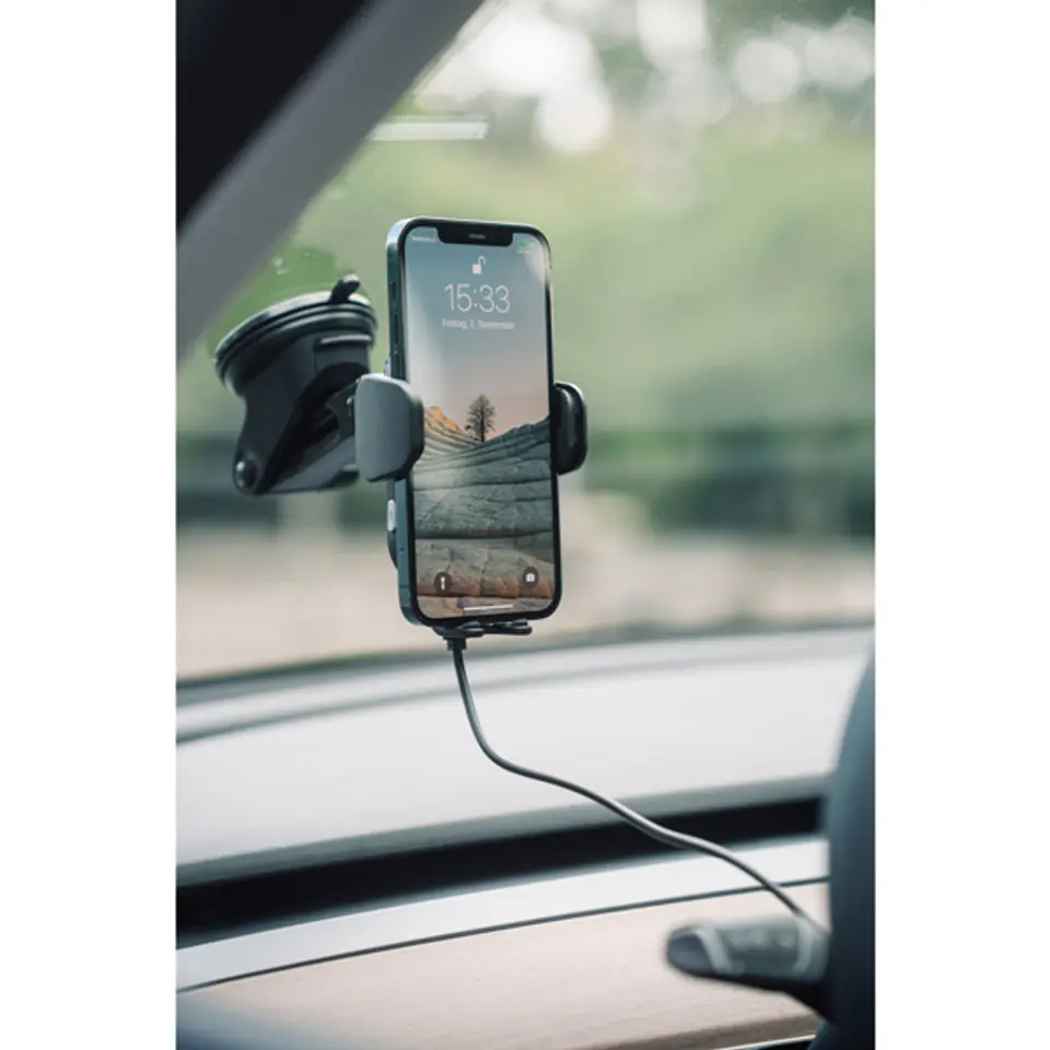 Wireless phone charger for your carVerbatim’s fast-charging phone holder uses high-speed Qi wireless charging technology to provide safe and fast charging for your Android or iPhone. The high-quality charging mount allows hands-free calls and easy viewing of GPS maps while quickly charging your Qi-enabled smartphone.Automatic opening and closingThe fast-charging phone holder is easy to use, secure, and convenient. Choose between installing the holder into your car's air vent or fitting it to the dashboard or window via the suction pad. When the phone is placed in the holder, the side clamping arms automatically close and hold the phone in place. The arms open with the press of the buttons on either side of the charger. The holder can rotate through 360° allowing for optimum viewing and easier use of functions.Fast Qi mobile phone chargingThe Verbatim phone holder uses Qi induction technology to charge your phone quickly and easily once it is placed into the holder. With a maximum charging power of 15W, the car phone holder with charging function is optimised to keep your phone's battery healthy with sufficient charging efficiency. It can even charge through phone cases with a thickness of up to 4mm.Note: The maximum input power varies depending on phone model. For example, the Samsung S21 can charge at 15W, Samsung S20 at 10W, iPhone 13 Pro at 7.5W and Google Nexus at 5W. Please check your phone specifications for the maximum charging watts.Product DetailsPart Number: 49552 Wireless charger for Qi enabled phones Qi certified Three mounting options: vent holder, suction cup on dashboard, or front window Output: 15W/10W/7.5W/5W self-adaptation Automatic open/lock 360° rotatable Release buttons on both sides One-handed operation Anti-slip & anti-scratch silicone on both arms and foot 2-year limited warranty- Electro-magnetic induction- Input (requirements for adapter): 9V/1.67A; 12V/1.5A-3A- Output: 15W / 10W / 7.5W / 5W (auto-adaptation)- Working frequency: 110 KHz-205KHz- Product standard: Qi (Qi certified)- Charging distance: ?10mm- Charging efficiency: ?80%- Cable: USB-C to USB-A cable, 1m, 25g- One-handed operation thanks to touch button system- Duration of rest power after power off: 5 hours- Duration of ability to open/close clamps after power off: 30 minutes- How many times arms can be opened after power off: 2-3 times- Triangle support: yes- 2 LED status indicators: -- Standby LED light: green-- Charging LED light: blue- Anti-slip & anti-scratch silicone on both arms and foot: yes- Phone case thickness max. (mm): 4mm- Phone width min to max (mm): 60-90- System requirements: USB Port with QC 3.0 compatibility (not included)- Protective functions: Over-voltage protection / Over-current protection / Over-temperature protection / Short circuit protection / FOD (foreign object detection)- NPO capacitors: Lower charging temperature and high charging efficiency- Product dimension: 114mm x 71mm x 54.8mm- Product material: ABS+PC- Product weight: 115g - 2 x touch buttons: 1x on the left and 1x on the right sidePackaging languages: English; French; German; Dutch; Italian; Spanish; Portuguese; Polish; Russian; Czech; Hungarian; Slovakian; Croatian; Serbian; Romanian; Turkish