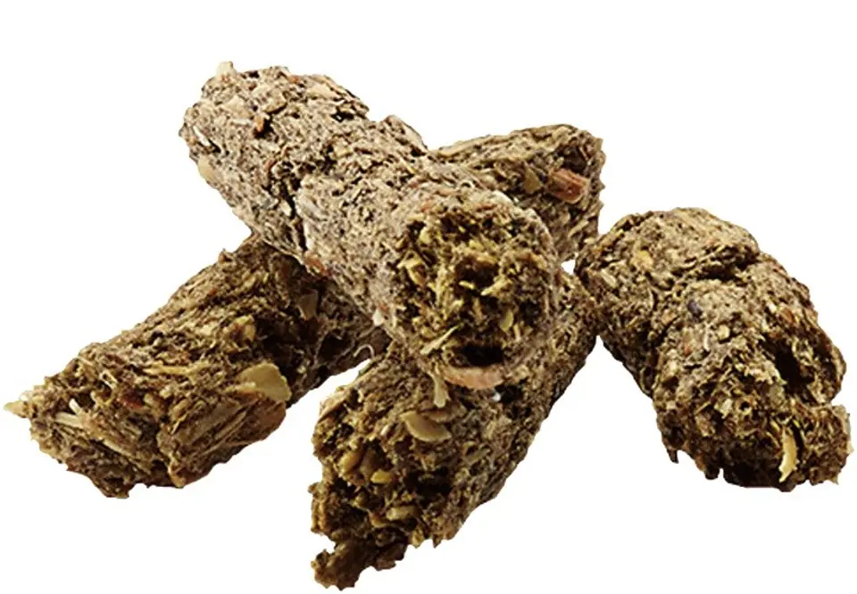 derivatives of vegetable origin (23% timothy, alfalfa, grasses and herbs), vegetable protein extracts, seeds (2% linseed), minerals, fructooligosaccharides (0.3%), calendula, yucca
