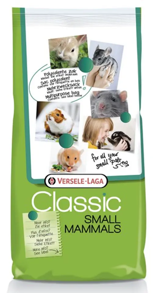 Complete mixture for rodents, containing cereals, nuts, carob, vegetable extrudate and vitamins.