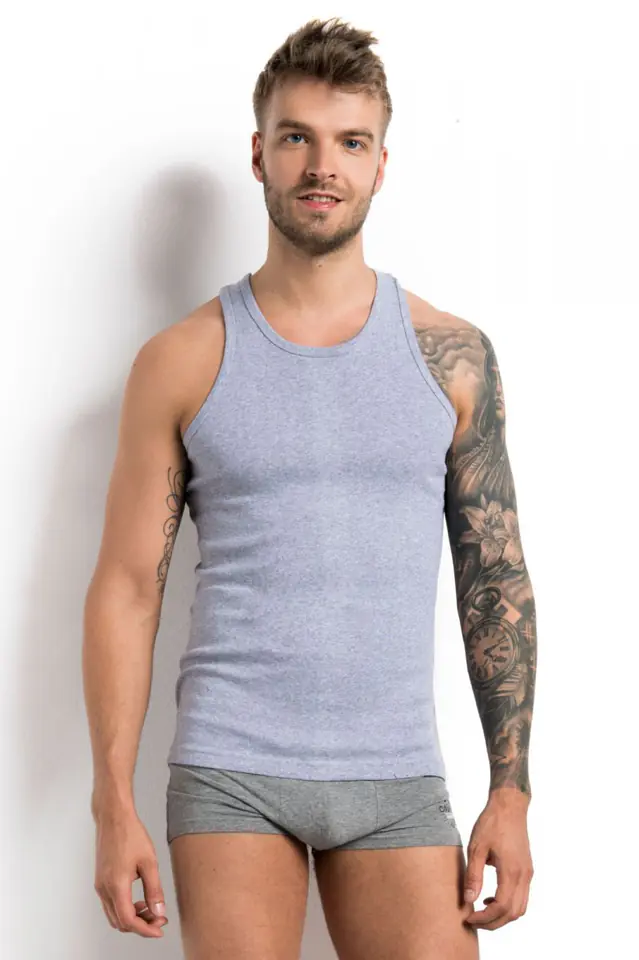 Simply Basic - gray men's vest with wide straps, No. 1480 by Henderson. A true classic that no man should forget. Fitted to the body, elastic, made in "Body Fit" technology. Good quality and proven, sporty cut. Perfect for hot days, good as pajamas, homewear or under a sweater. Universal and timeless. Composition: 100% cotton.