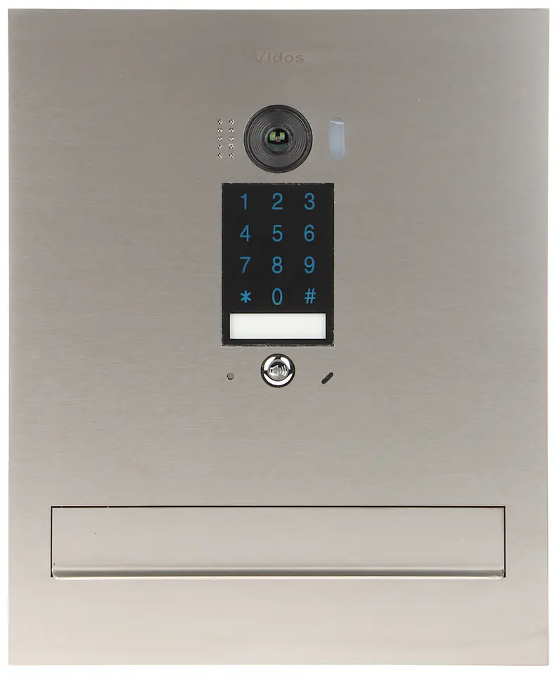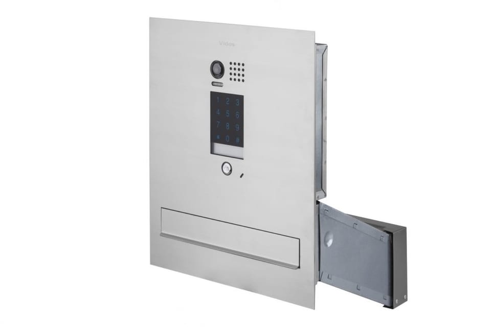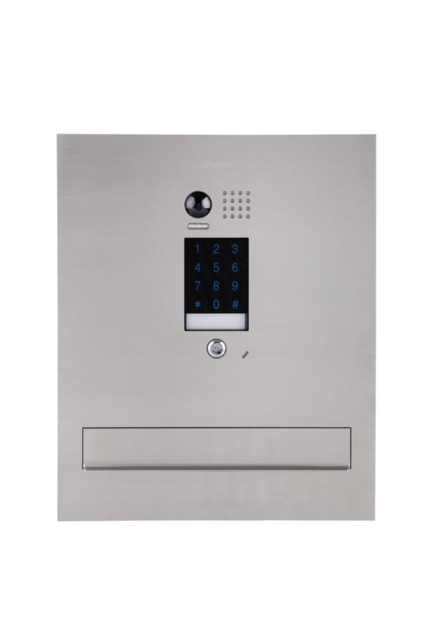 Video intercom integrated with a single-throw, through letter boxThe box is designed for installation in a fence post or wallThanks to the use of the highest quality materials, it is resistant to weather conditions
